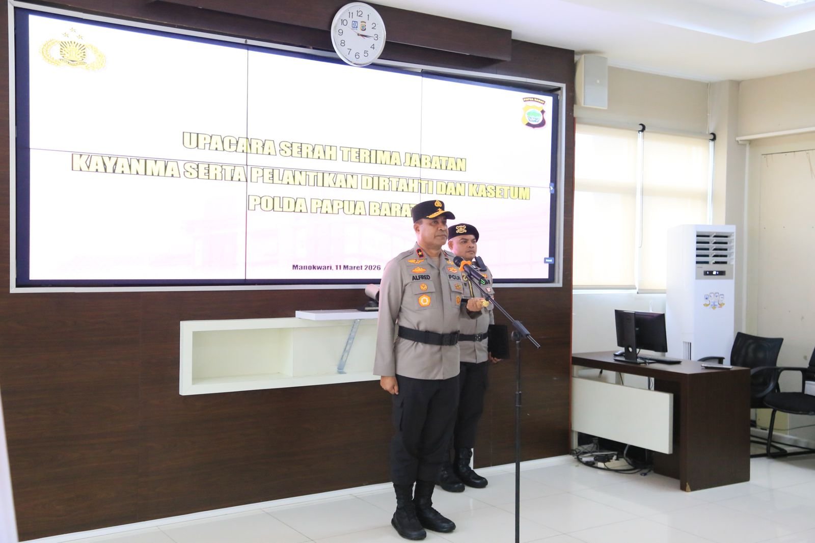 Manokwari – Polda Papua Barat menggelar upacara serah terima jabatan Ka Yanma serta pelantikan Dir Tahti dan Ka Setum Polda Papua Barat yang dipimpin langsung oleh Kapolda Papua Barat Brigjen Pol Alfred Papare, S.I.K. pada hari Rabu, (11/03/26) pukul 15.00 WIT bertempatdi Ruang Vicon Lantai 2 Mapolda Papua Barat.