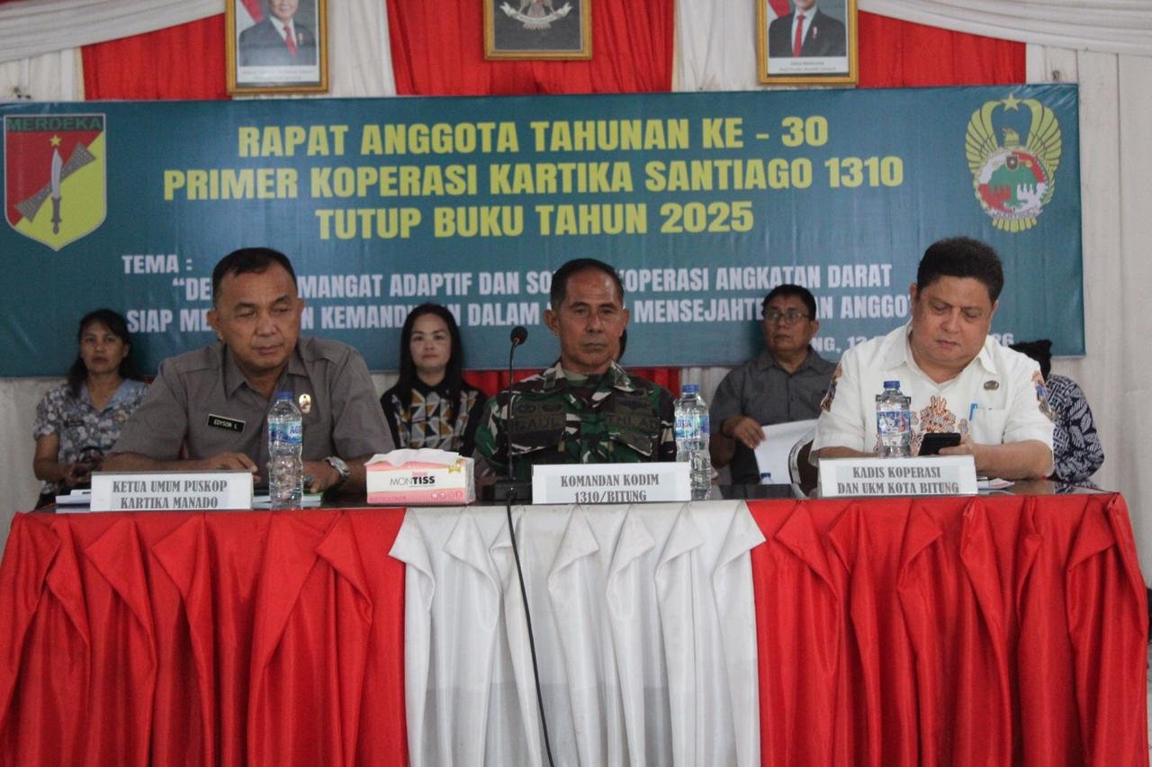 Bitung – Kodim 1310/Bitung menggelar Rapat Anggota Tahunan (RAT) Ke-30 Tutup Buku Tahun 2025 Primkop Kartika Santiago 1310 yang mengusung Tema “Dengan Semangat Adaptif dan Solutif Koperasi Angkatan Darat Siap Membangun Kemandirian Dalam Rangka Mensejahterakan Anggota”. Kegiatan berlangsung di Aula Makodim 1310/Bitung, Jl. Babe Palar Kel. Madidir Unet, Kec. Madidir, Kota Bitung, Jumat, (13/02/2026).